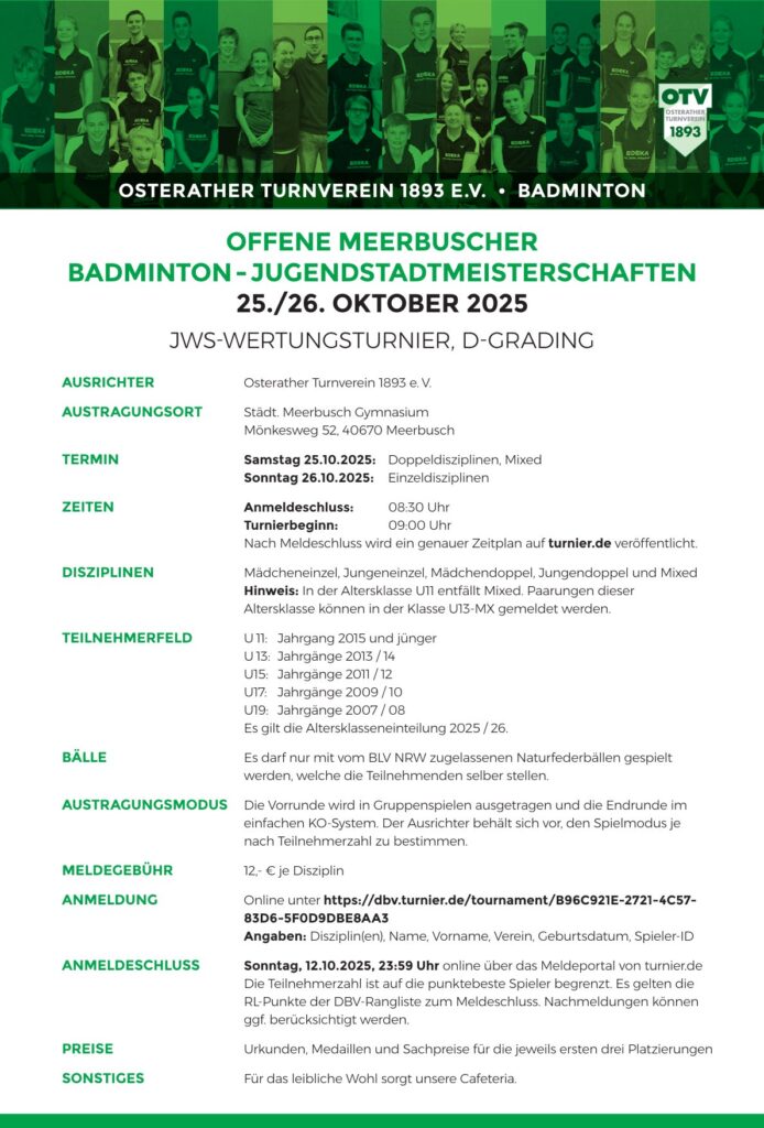 der Osterather TV veranstaltet am 25. und 26. Oktober 2025 die Meerbuscher Jugendstadtmeisterschaften. Hierzu möchten wir Euch herzlich einladen!